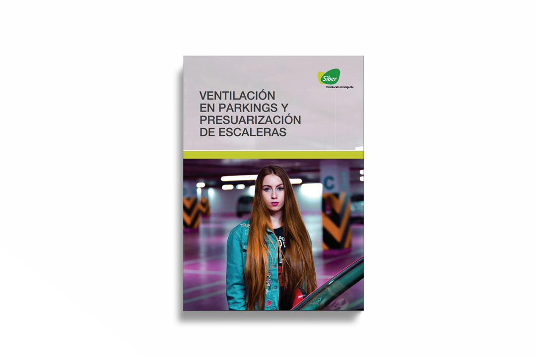 Ventilación Parkings y presurización escaleras" describe las soluciones de ventilación y presurización desarrolladas por Siber para aparcamientos subterráneos y escaleras de emergencia. Destaca la necesidad de ventilación en parkings para reducir la contaminación por gases de vehículos y facilitar la evacuación de humos en caso de incendio. Se mencionan normativas como el CTE y la norma inglesa BS-7346-7.