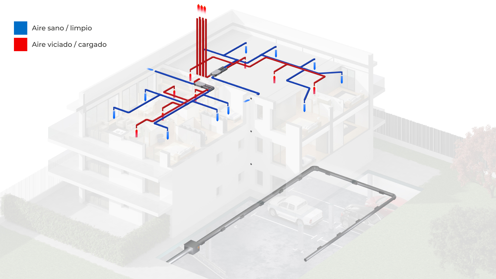 - Extracción y renovación del aire: El sistema extrae el aire viciado del interior del edificio, que proviene de espacios como cocinas, baños y lavaderos. Este aire se reemplaza con aire fresco que se toma del exterior.
