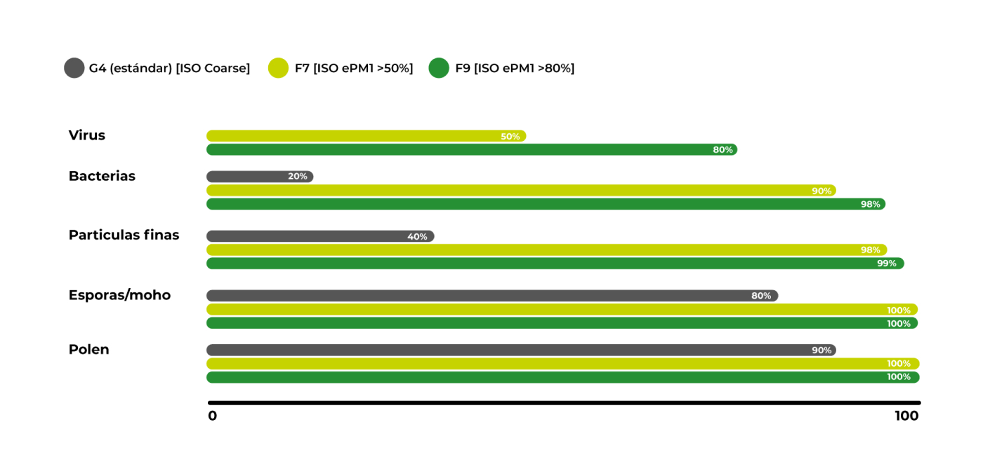 - Filtros F7 : Eliminan el 90% de bacterias y partículas más pequeñas.