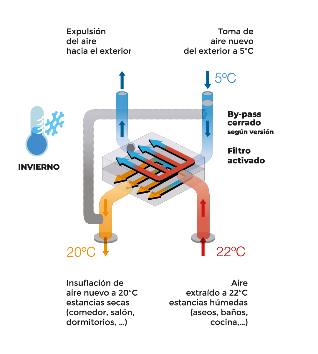 El aire frío del exterior se cruza sin mezclarse con el aire caliente y viciado que se expulsa del interior. De esta manera se consigue impulsar aire limpio y atemperado en la vivienda.