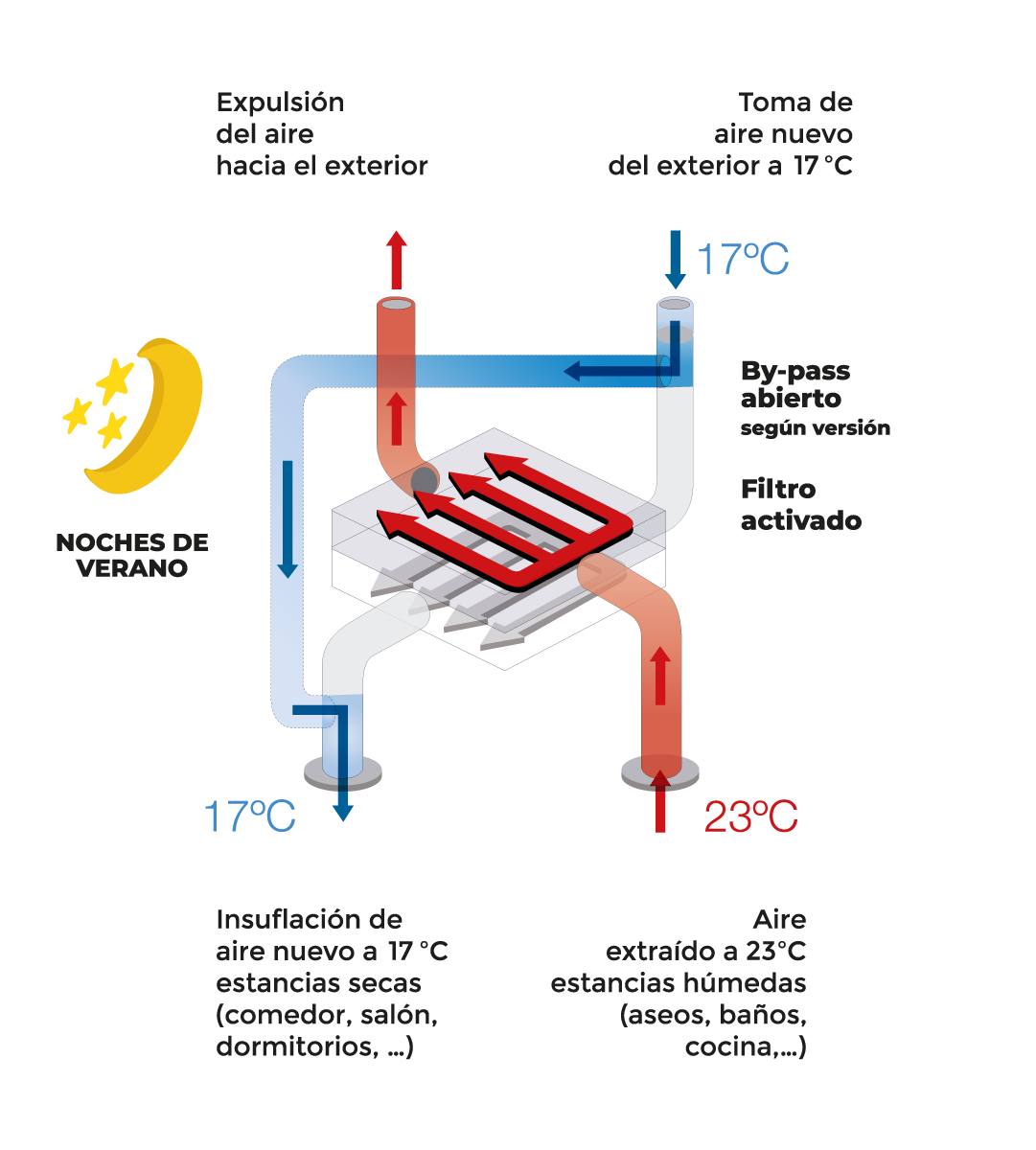 En el caso que el aire exterior tenga una temperatura más agradable que la del interior, como puede pasar en las noches de verano, el By-pass se activará de forma automática. De esta forma estaremos renovando el aire de la vivienda de forma filtrada y sana