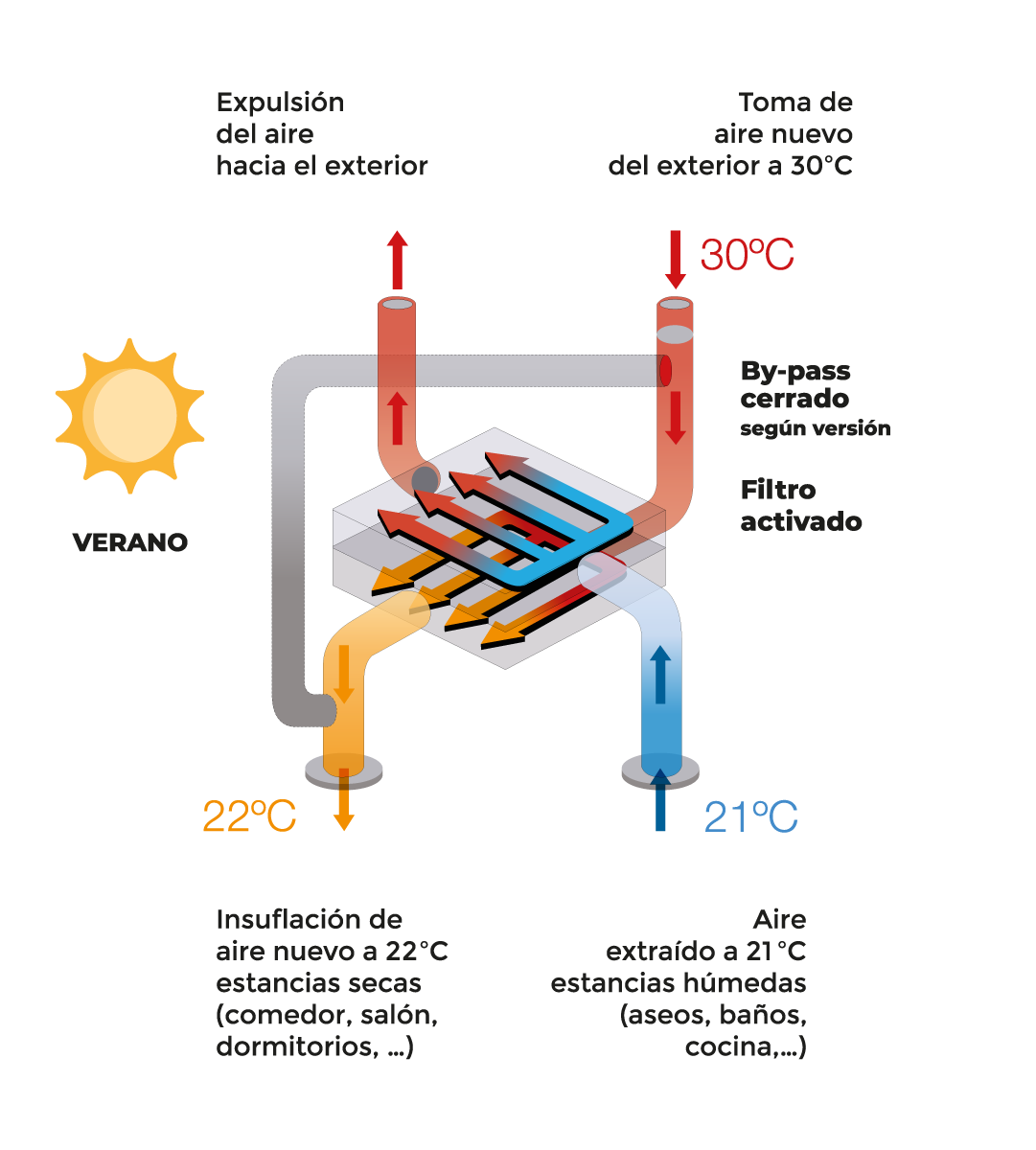 En verano ocurre el mismo proceso pero a la inversa, el aire caliente del exterior se cruza sin mezclarse con el aire frío y viciado que se expulsa del interior.