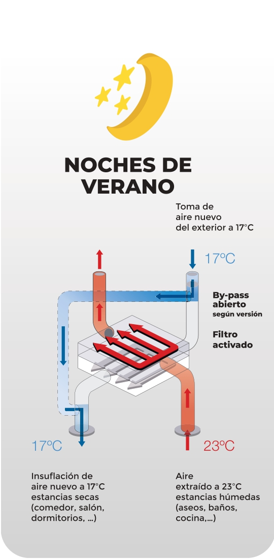 No caso de o ar exterior ter uma temperatura mais agradável do que a do interior, como pode acontecer nas noites de verão, o By-pass ativar-se-á automaticamente. Desta forma, estaremos renovando o ar da habitação de forma filtrada e saudável.