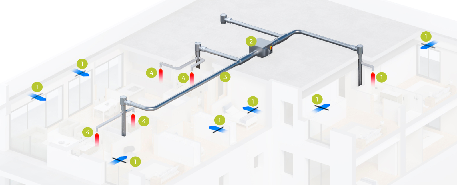 A opção mais eficiente para edifícios multifamiliares com múltiplas unidades. Um único sistema centralizado gere a ventilação de todo o edifício, proporcionando um fluxo de ar constante e equilibrado. O seu design otimiza os custos operacionais e facilita a manutenção, garantindo uma qualidade de ar uniforme para todos os residentes.
